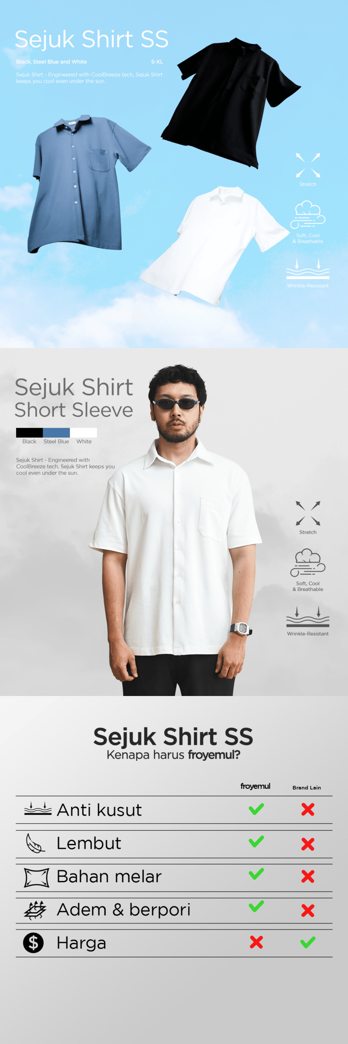 SEJUK SHIRT SS - Dengan teknologi Coolbreeze untuk bahan Microcotton Danbowl 210gsm yang membuat kain ini tetap terasa sejuk dan dingin saat dipakai dan menyentuh ke kulit. Cuttingan slim-fit cocok untuk tampilan semi formal dan kasual.